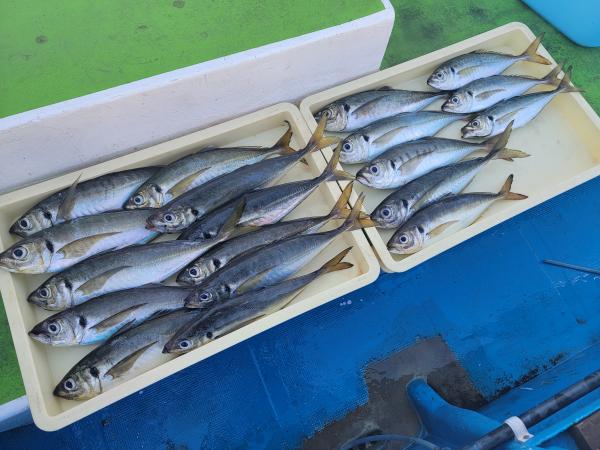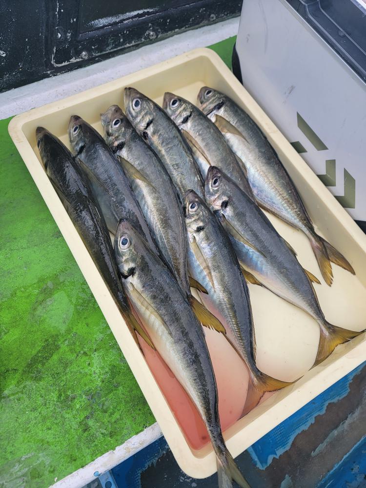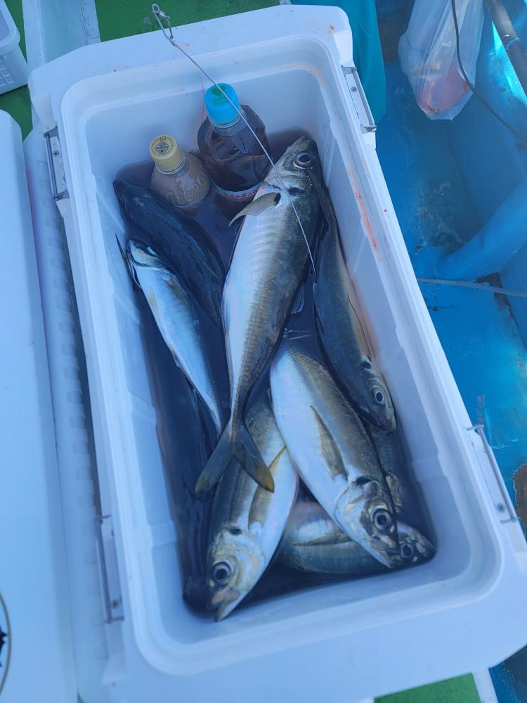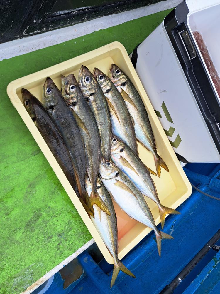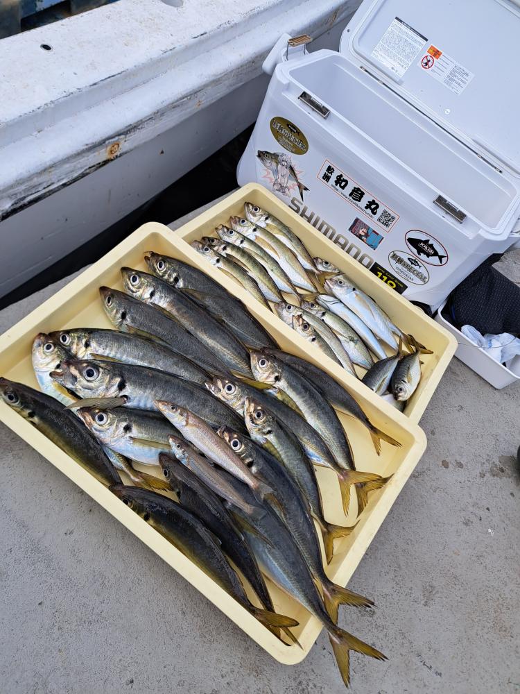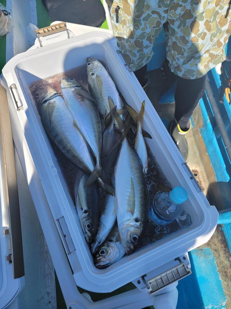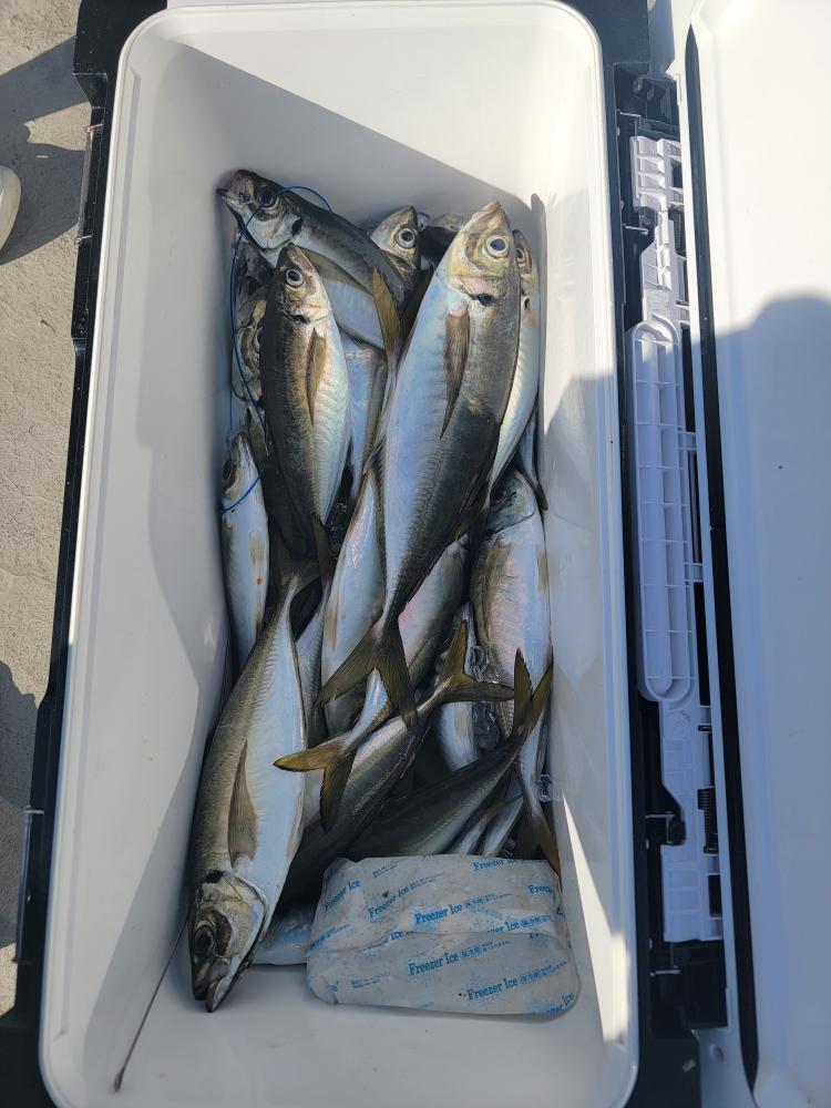 ショートビシアジ乗合に出船しました。出船時は波風ありましたが、ポイント近くは風影となり問題ない天候でスタート。特大サイズがポツリポツリとヒットも次第に潮が流れなくなり小振りのみに。風も凪ぎて来たので転々と探し、後半は高活性な群れ見つかり中型主体にラッキーな方は特大も混じってお土産いっぱいになりました。
